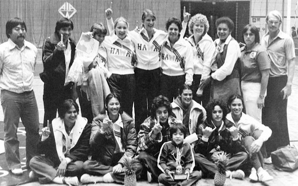 Thompson (standing, third from right) with the 1979 University of Hawaii Rainbow Wahine volleyball team, which had just captured the school’s first national championship. That’s Dave Shoji standing second from left.