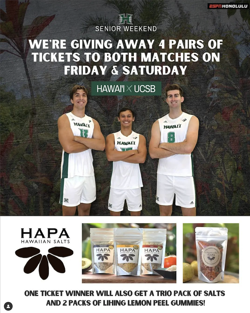 We can’t believe it’s already Senior Weekend for the three UH Men’s Volleyball seniors! ESPN Honolulu is giving away 4 pairs of tickets to both matches on Friday (April 8th) and Saturday (April 9th)! One lucky ticket winner will also win a trio pack of salts and 2 packs of lihing lemon peel gummies courtesy of @hapahawaiiansalts!