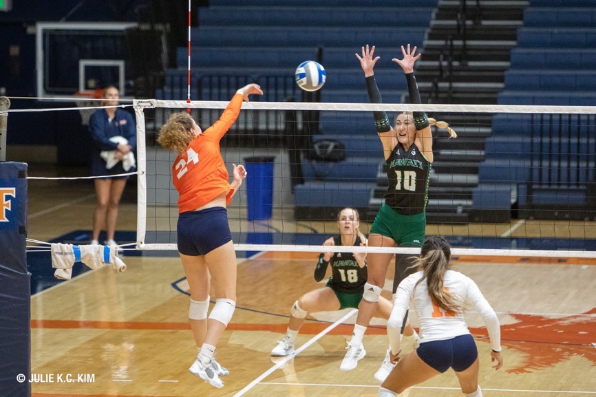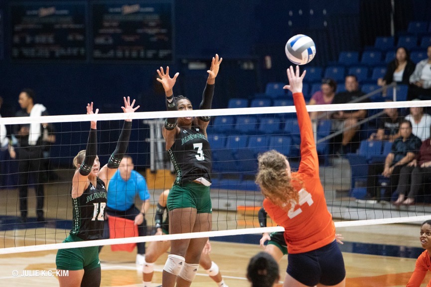 Sure UH has started matches slow sometimes this season, as evident by the 10-6 deficit in the first set against. But if you’re going to get down in a set, do so early enough to give yourself enough time to make a comeback. In the blink of an eye, UH had it tied at 11. Eight kills by Amber Igiede in Set 1 gave UH the 25-20 victory. A two-point lead at 8-6 ballooned to 28-10 as the Bows won set 2 25-15. Tayli Ikenaga went back to the service line in Set 3 at 8-7. When she left, it was 19-8. UH comfortably won the frame 25-13 to defeat Cal State Fullerton in straight sets. It was the 9th-straight 3-0 win by UH over the Titans in Fullerton and overall, UH now a perfect 46-for-46 all-time against Cal State Fullerton. UH was focused and locked throughout the 82 minute sweep. The Titans came into the week 20th in the NCAA with 16.32 digs per set; they had a total of 37 in three sets. All but one Rainbow Wahine player saw action. Making her UH debut was Kennedi Evans, the transfer from Utah. The #Sistahhood was on full display as the UH bench went crazy as Evans was subbed in. It was from crazy to jubilation as Evans served the walk-off ace as UH improved to 3-0 in BWC play.