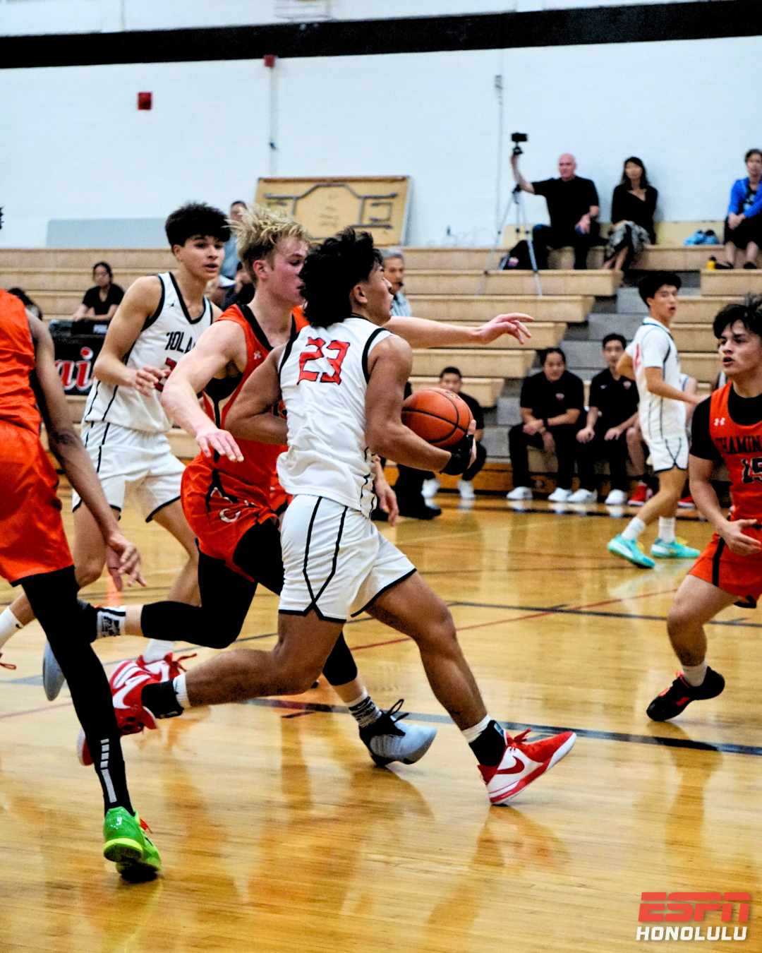 “They’re big, they’re physical, the point guard (Aidan Wong) controls the ball well, 20 (Goo) and 23 (Taliauli) can stroke it … we had film on them, so we knew what we were getting into,” Chaminade coach Bryan Cantwell said of ‘Iolani. “But when they came out with the three bigs (6-foot-5 Lau Kong, 6-4 Tobin and 6-5 Jackson Dempster) to start the game and 11 (Wong) wasn’t going to start, that threw us a little bit … but we said OK, let’s just spread it out and attack it, attack the bigs.”