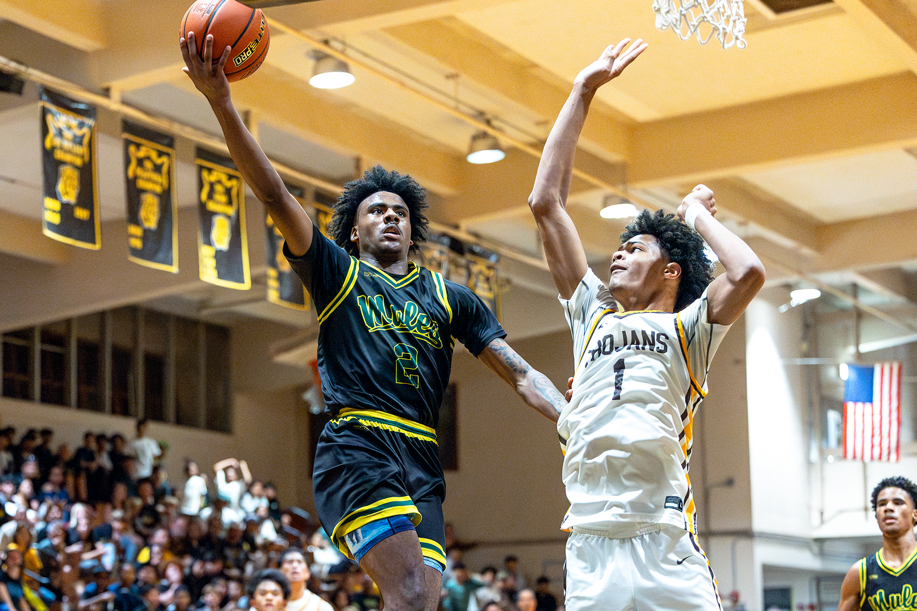 The thrilling finish capped an exciting game that was entertaining literally from the first basket — a backdoor alley-oop slam dunk by Dorn off of Ezekiel Virtudes’ lob — until the final horn. After a tight opening period, Mililani used a 9-0 run capped by Gabriel’s free throw to go up, 22-13, with 1:29 remaining in the half. Twain Wilson then drained a 3-pointer from the top of the key 22 seconds later to cut it to 22-16 at the break, and the Mules closed to 22-20 a minute into the second half after a jumper by Stevens and Twain Wilson’s steal and coast-to-coast layup.