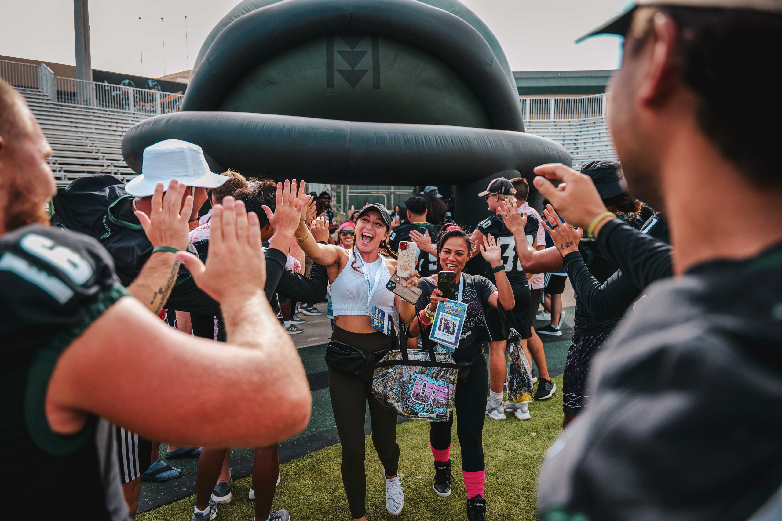 On the turf, women run drills with ‘Bows players and coaches. They placekick, tackle practice dummies, toss footballs, and learn how to stand at the line of scrimmage. Many chat and pose for pictures with the Rainbow Warriors.