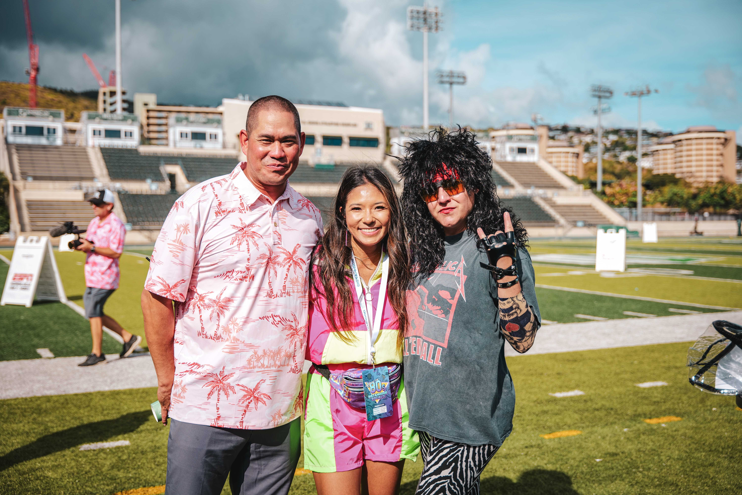Under the night sky, stadium lights illuminate UH Mānoa’s T.C. Ching Athletics Complex. Giant letters spelling “Sistahhood” stand by the Hawaiʻi logo at centerfield. Music blares from speakers, while an emcee banters with attendees, coaches and players. In line with the night’s theme—Ladies of the ‘80s—women dress in vibrant throwback clothing.