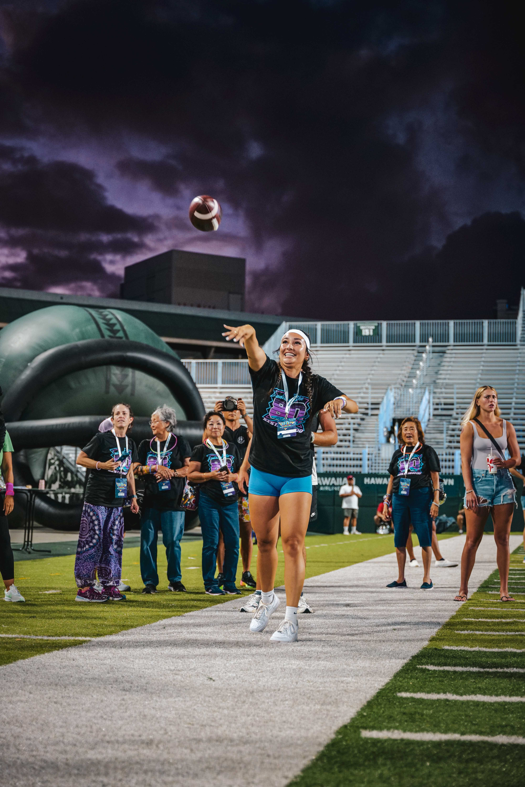 Perhaps the most popular person on the field is Sherry Chang, wife of UH head coach Timmy Chang. Chang spearheaded the Sistahhood Social in 2022 after her husband took leadership of the Warriors. As her third event winds down, she’s still posing for photos in a sporty neon outfit.