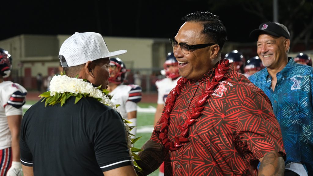 Alualu spent the next 14 years as Saint Louis’ running backs coach. In 2014, when Lee returned, Alualu found himself working alongside his former high school coach once more. Together, they guided the Crusaders to four consecutive state championships from 2016 to 2019.