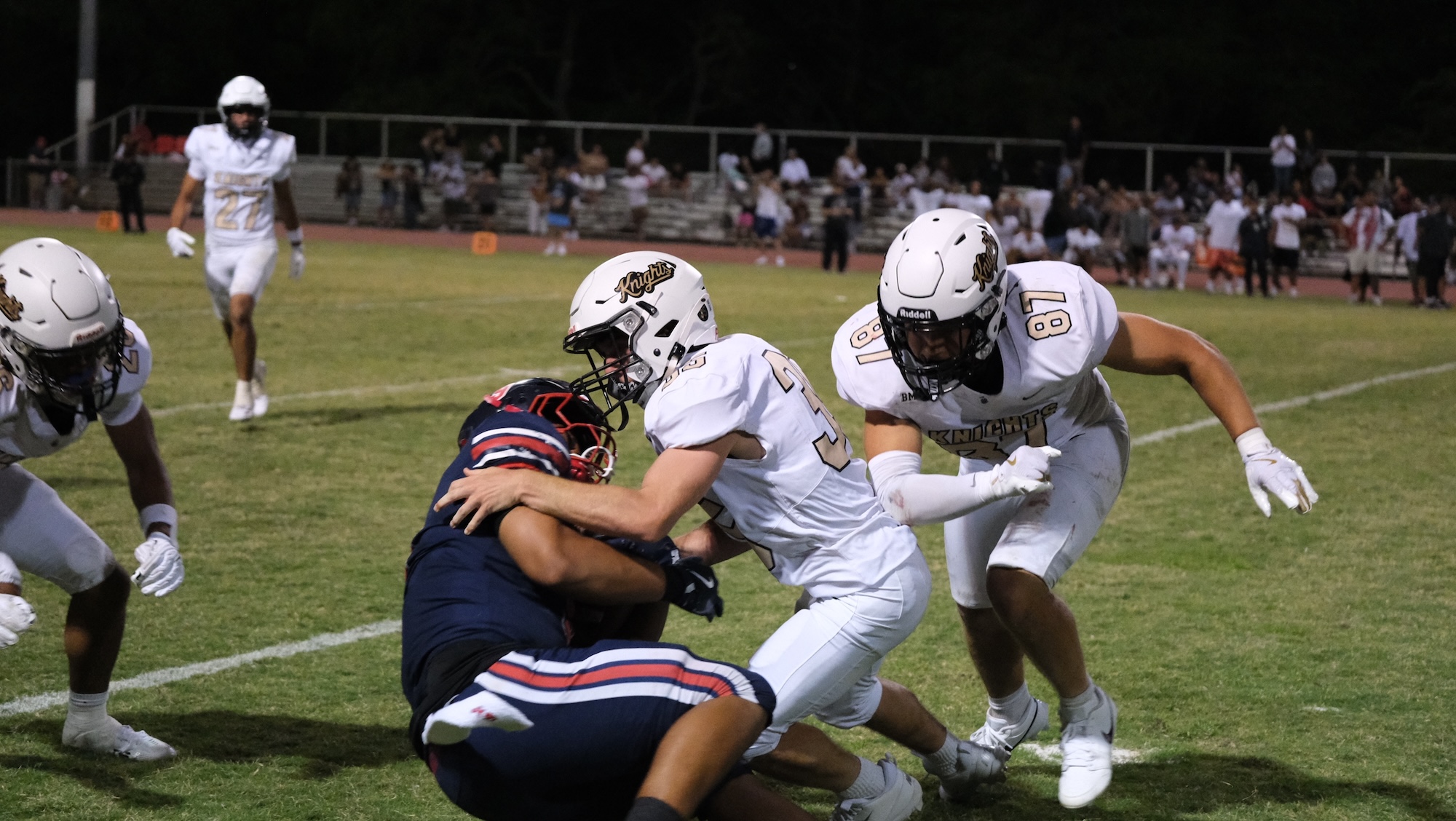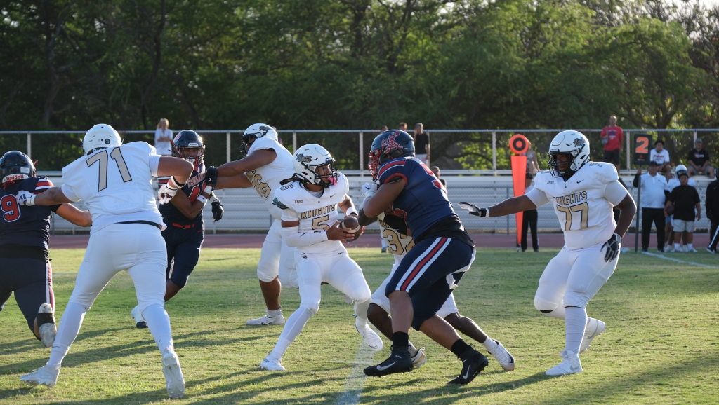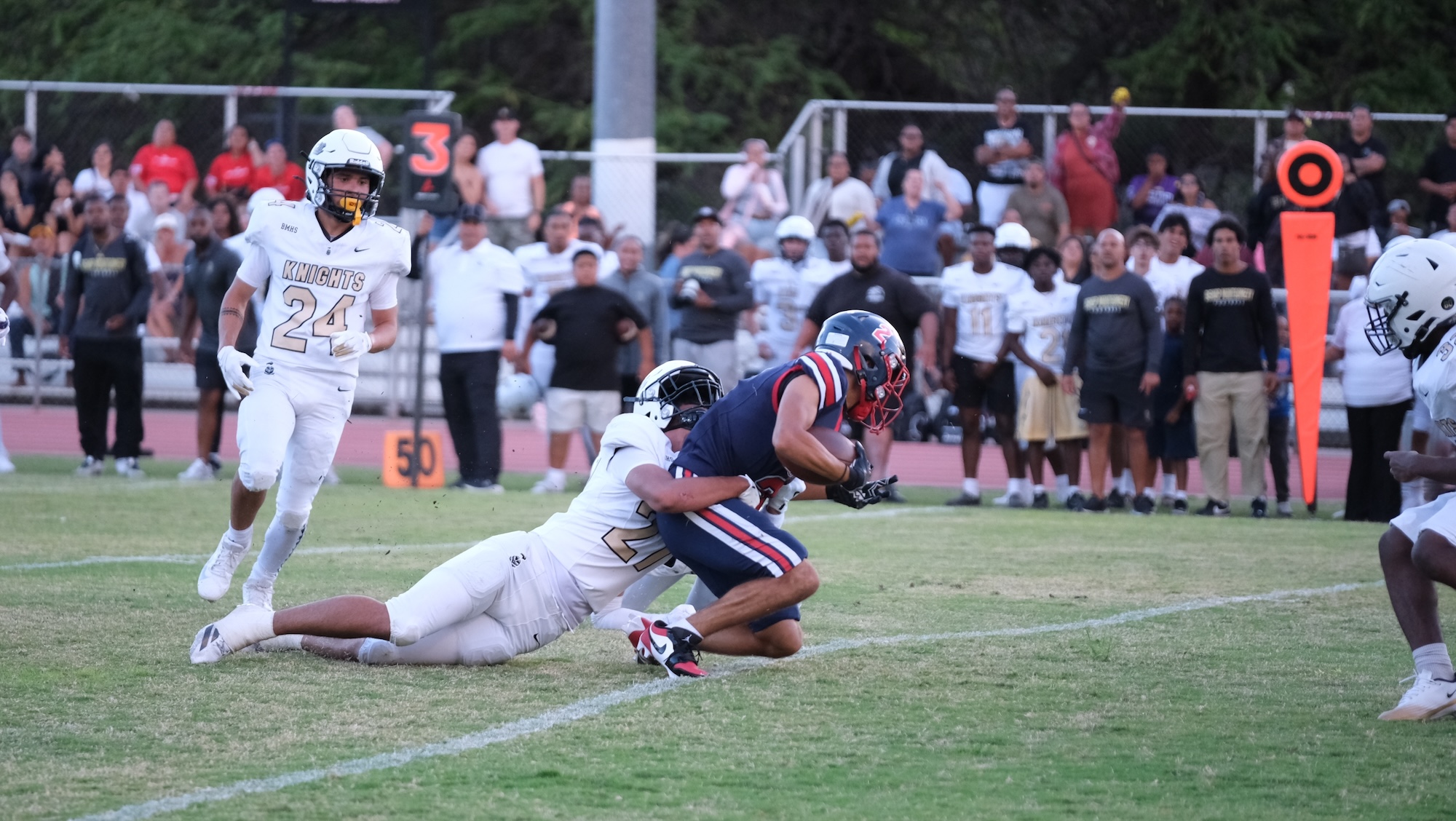 After the Knights closed the score to 34-21 on a touchdown and extra point with 51 seconds remaining, the Crusaders recovered the ensuing onside kick and began a new possession at their own 40-yard line. Saint Louis then threw a pass on first down that was intercepted and returned 45 yards for a “pick-6” that made the score 34-27 with 40 seconds still remaining.
