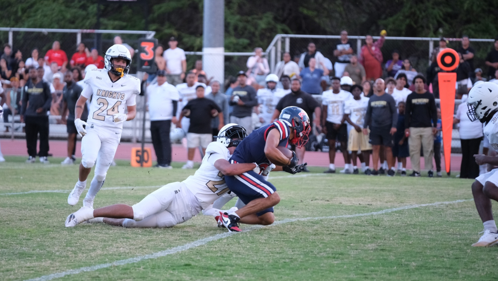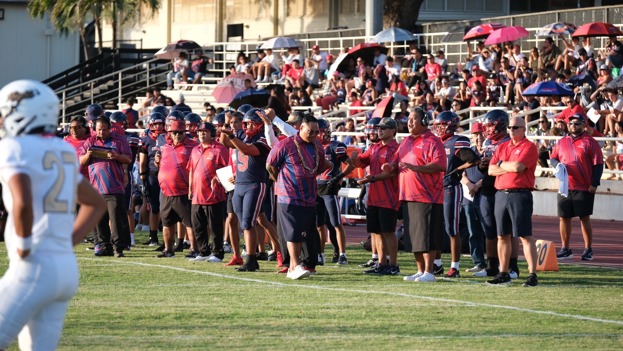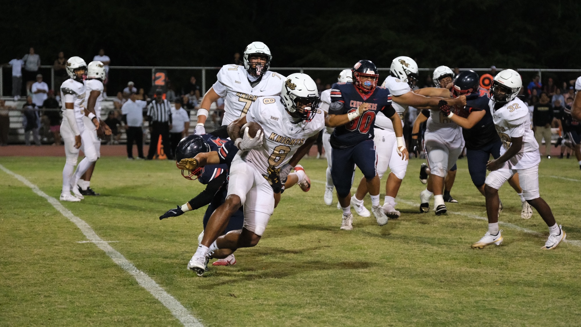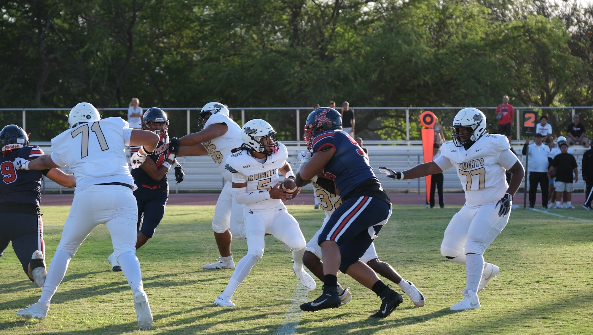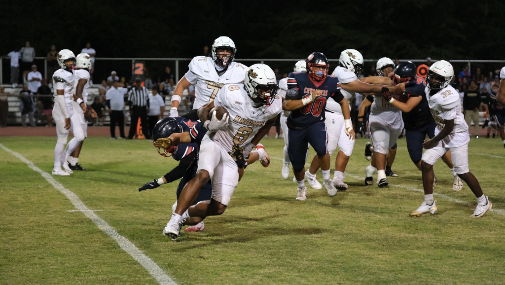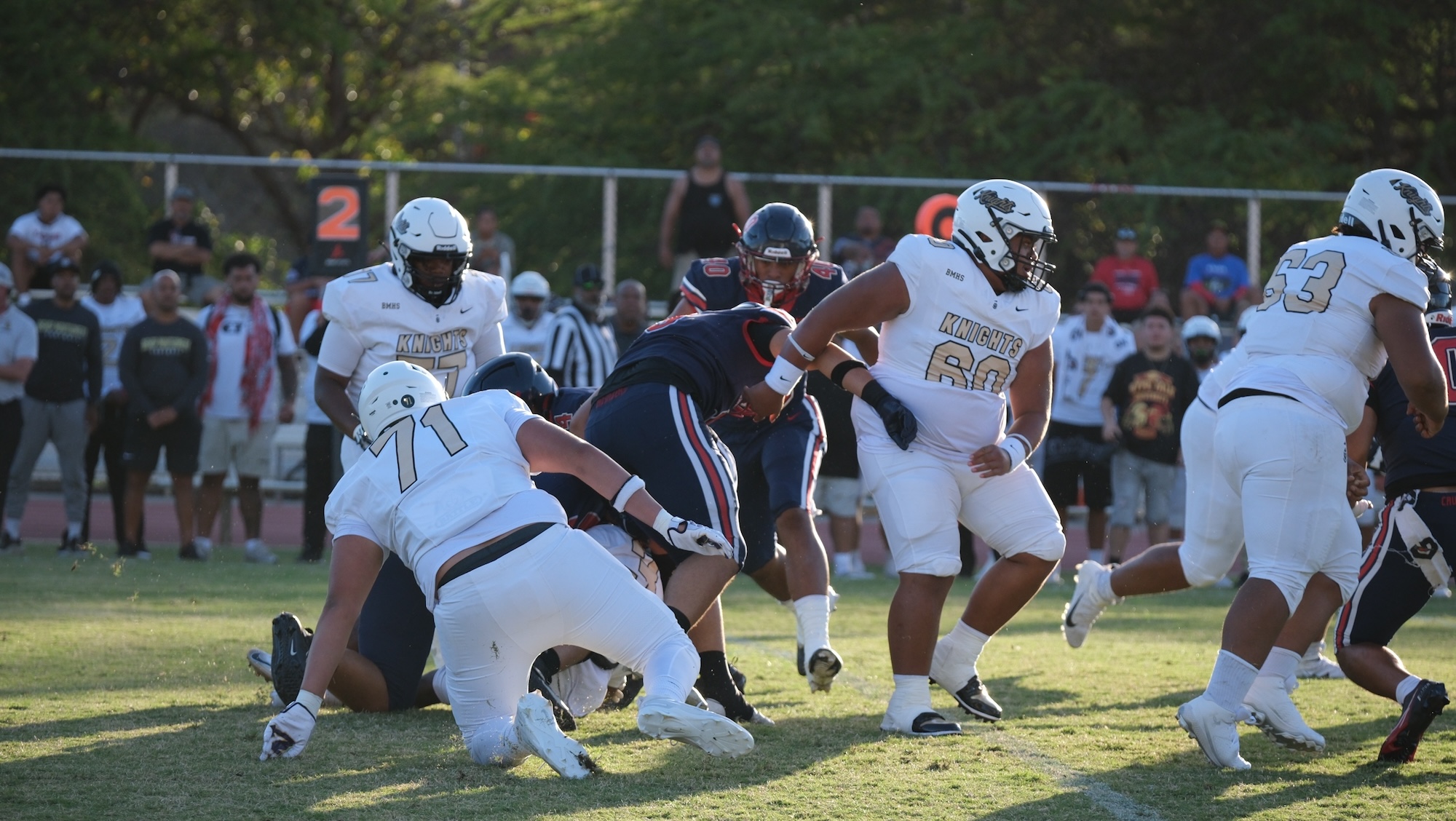 Saint Louis struck first with a 10-yard touchdown pass from Nainoa Lopes to Jordan Nunuha for a 7-0 lead, but the Knights tied it on the first play of the second quarter after a 10-yard passing TD. Bishop Montgomery later capped an 11-play, 60-yard scoring drive with a 9-yard touchdown run and extra point 20 seconds before halftime to take a surprising 14-7 lead into the break.