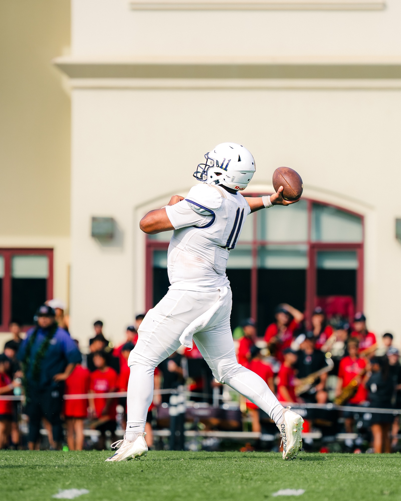‘Iolani did respond again, closing it to 21-14 at halftime after a 14-yard touchdown pass from Kane to Perkins, a sophomore who was making his first varsity start at quarterback after three-year starter CJ Villanueva suffered a shoulder injury two weeks ago at Leilehua.