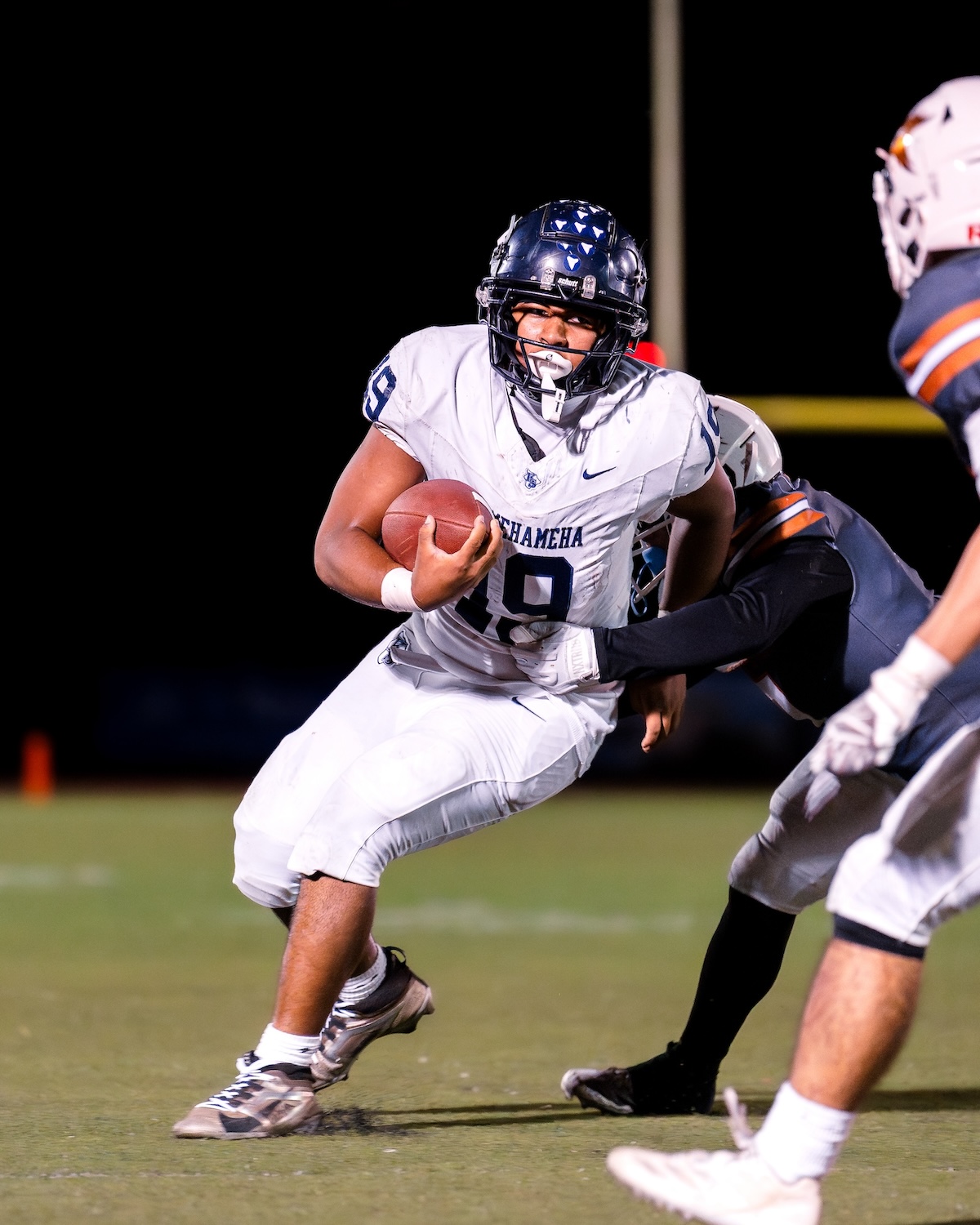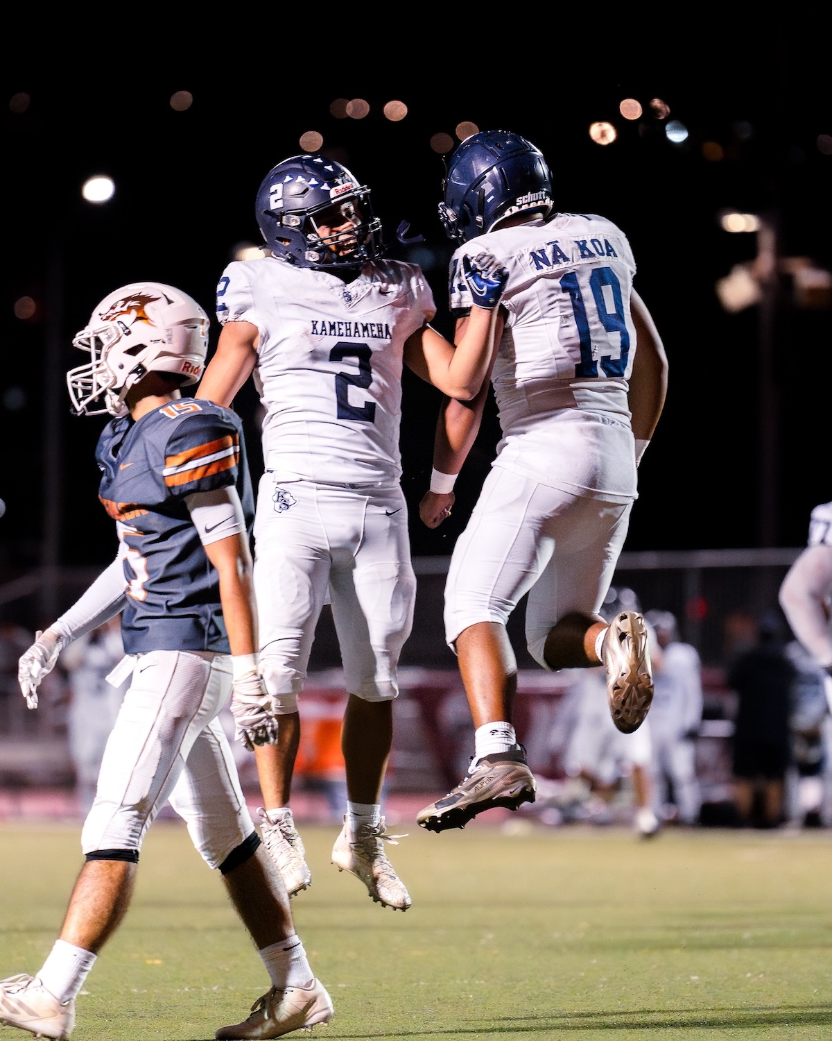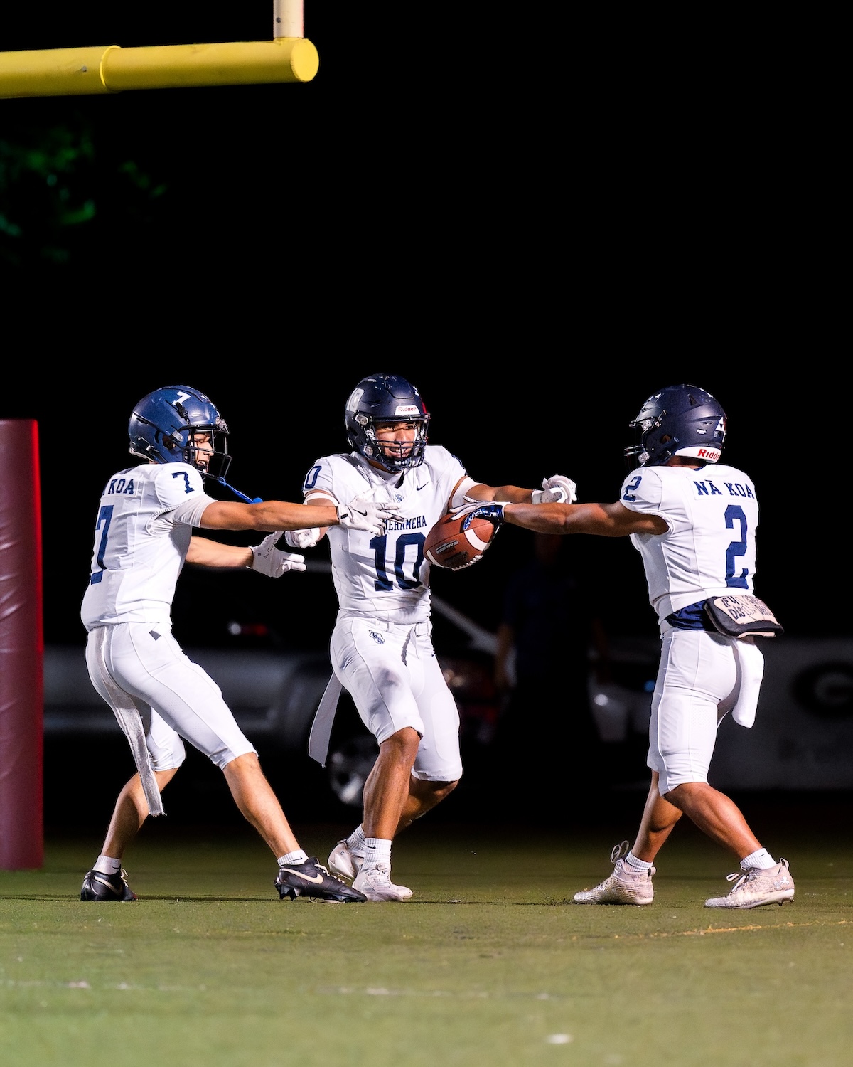 The Warriors broke open the game early in the fourth when Makekau connected on a medium route Wong, who darted upfield and then cut across to the right side and outran defenders all the way to the end zone, to help extend the margin to 28-6. Makekau then essentially sealed the victory with a 1-yard quarterback keeper with 8:57 remaining as Kamehameha-Hawai’i went up, 35-6.