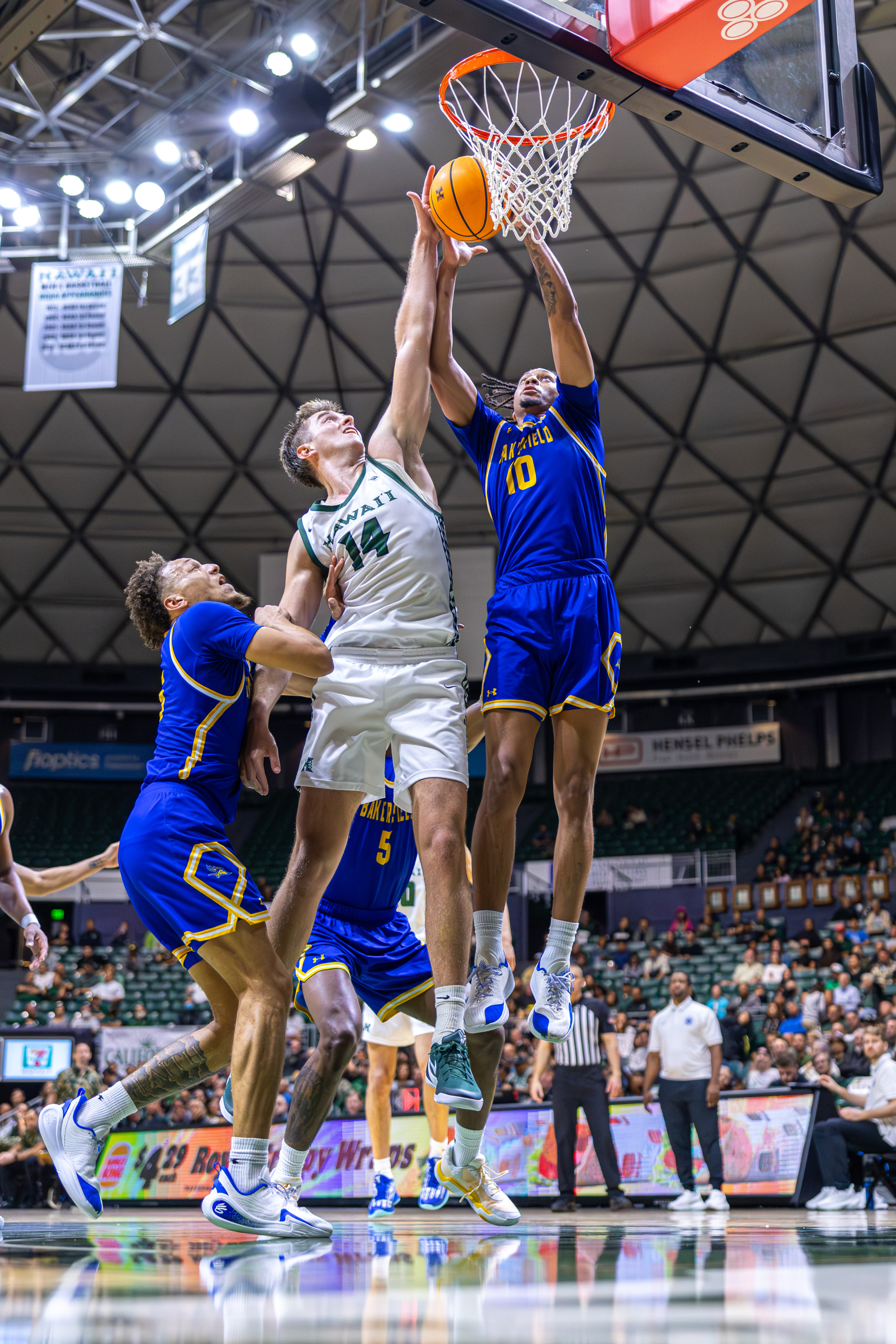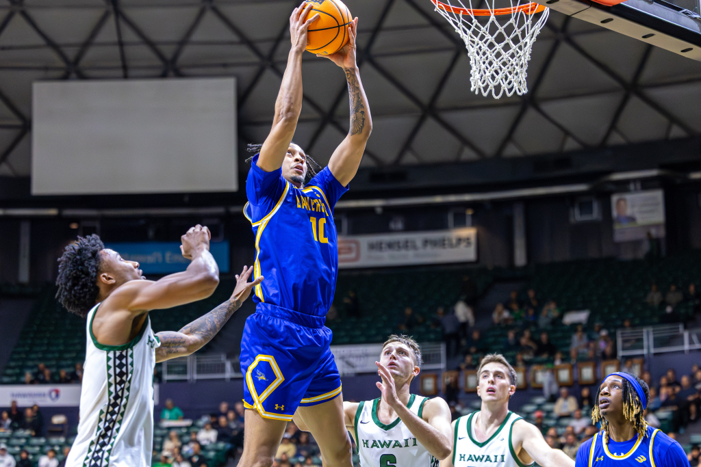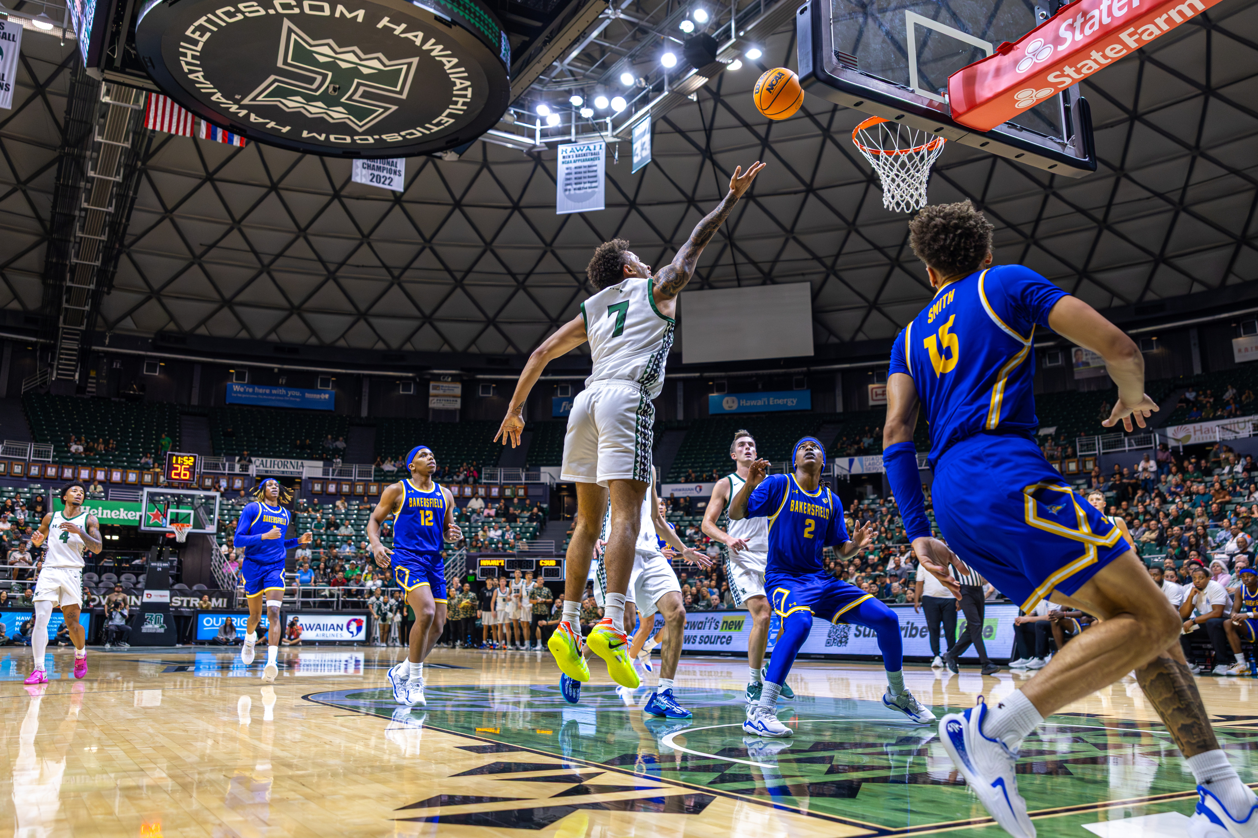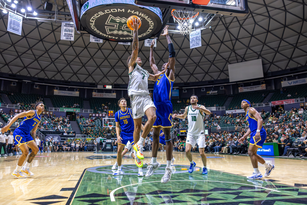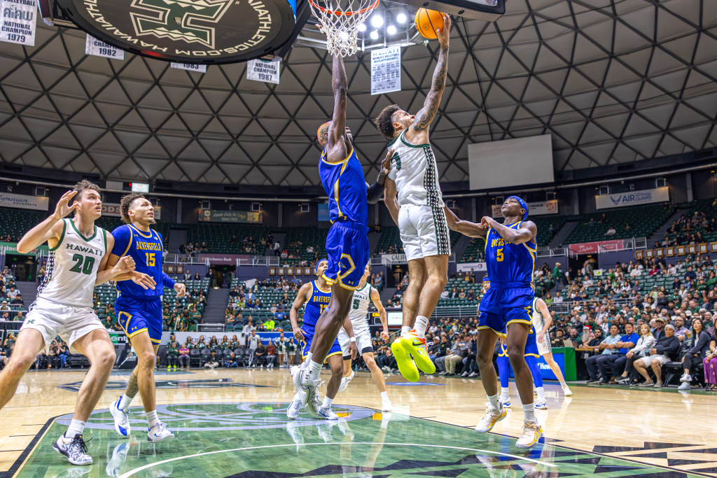 The dunk set the tone for the night, fitting for an evening that would mark a major milestone in Bullock’s collegiate career, as he led the Rainbow Warriors to a dominant 98–71 win over Cal State Bakersfield (8-13, 2-7 Big West), bouncing back after a loss at UC Santa Barbara.