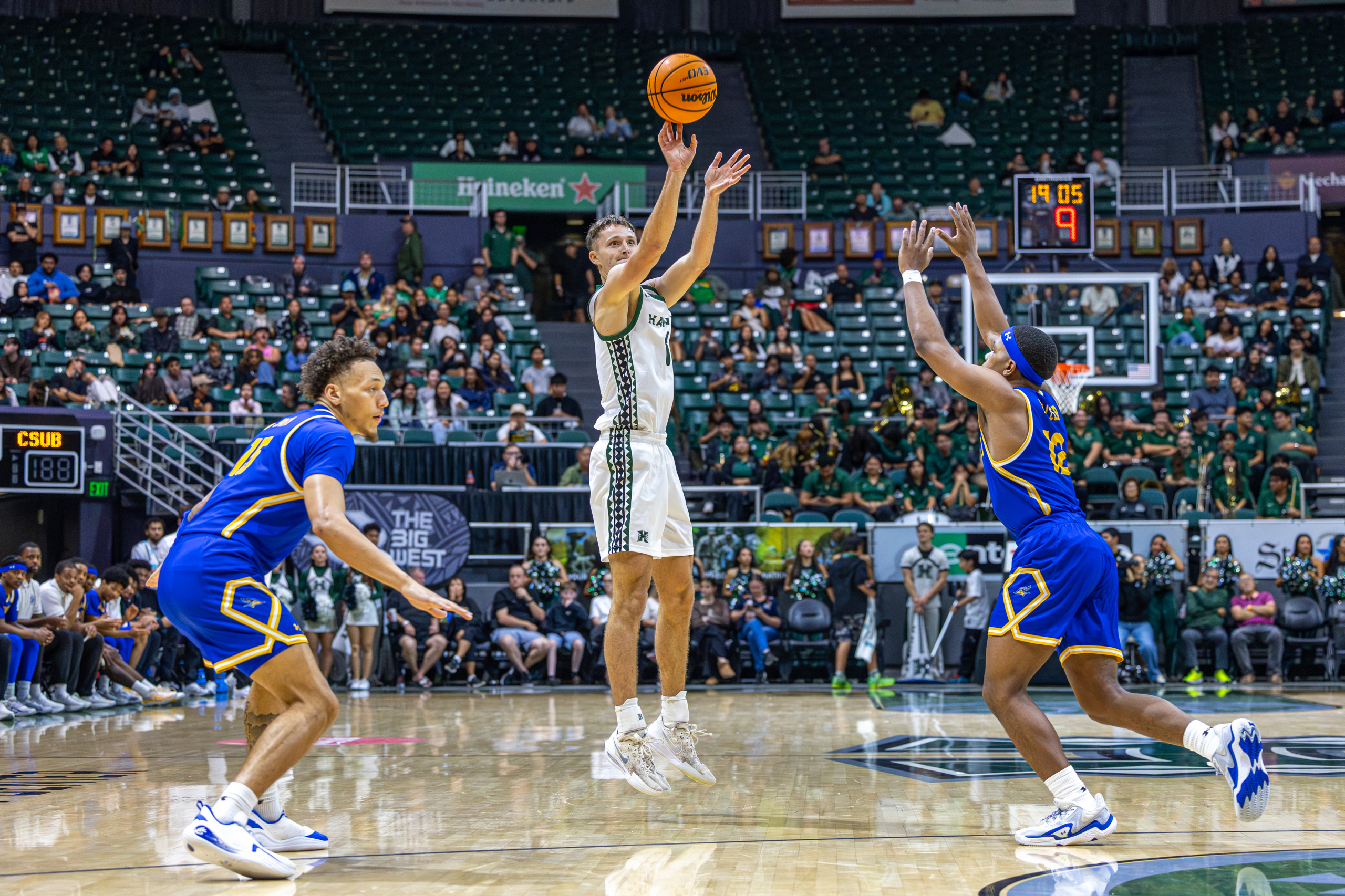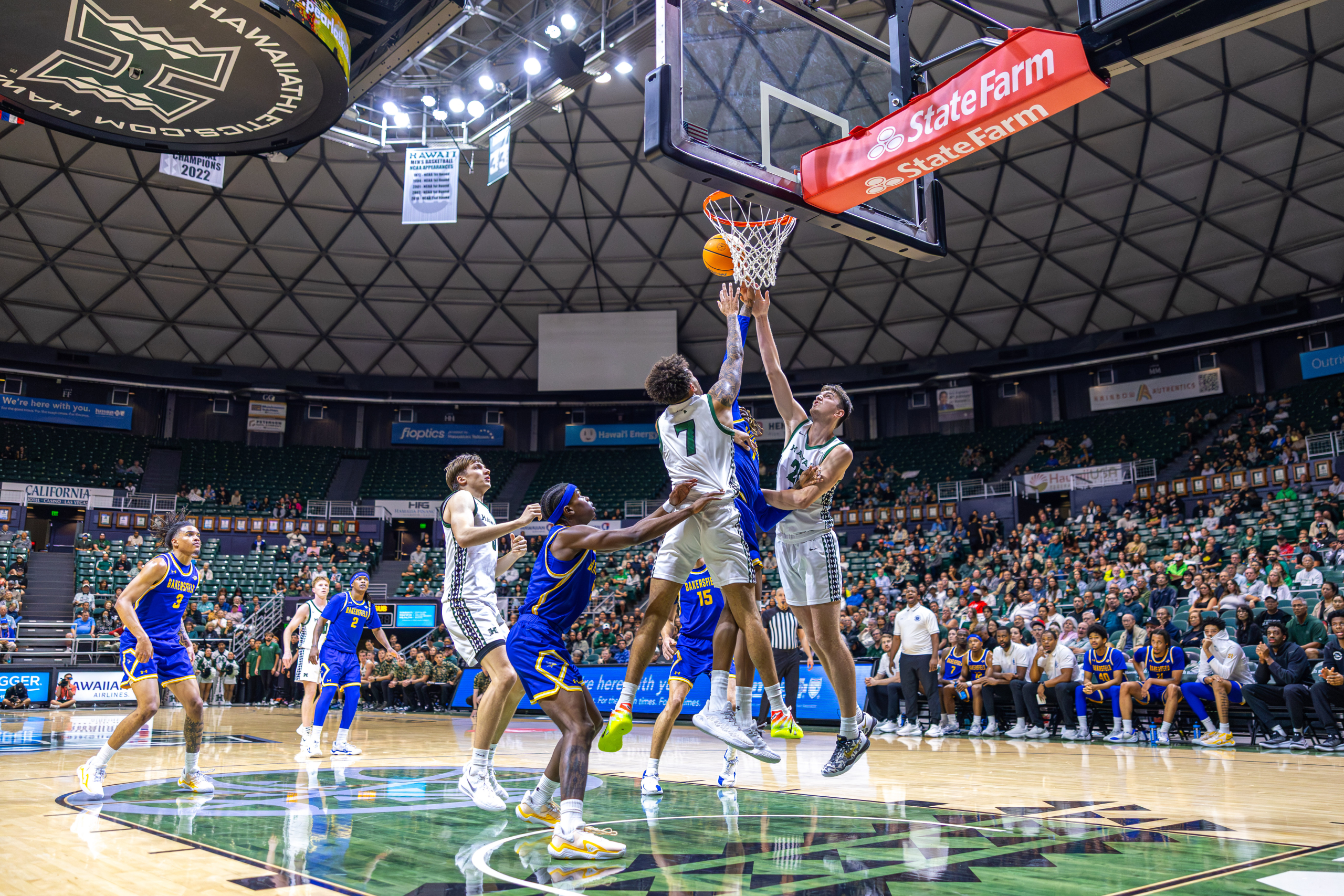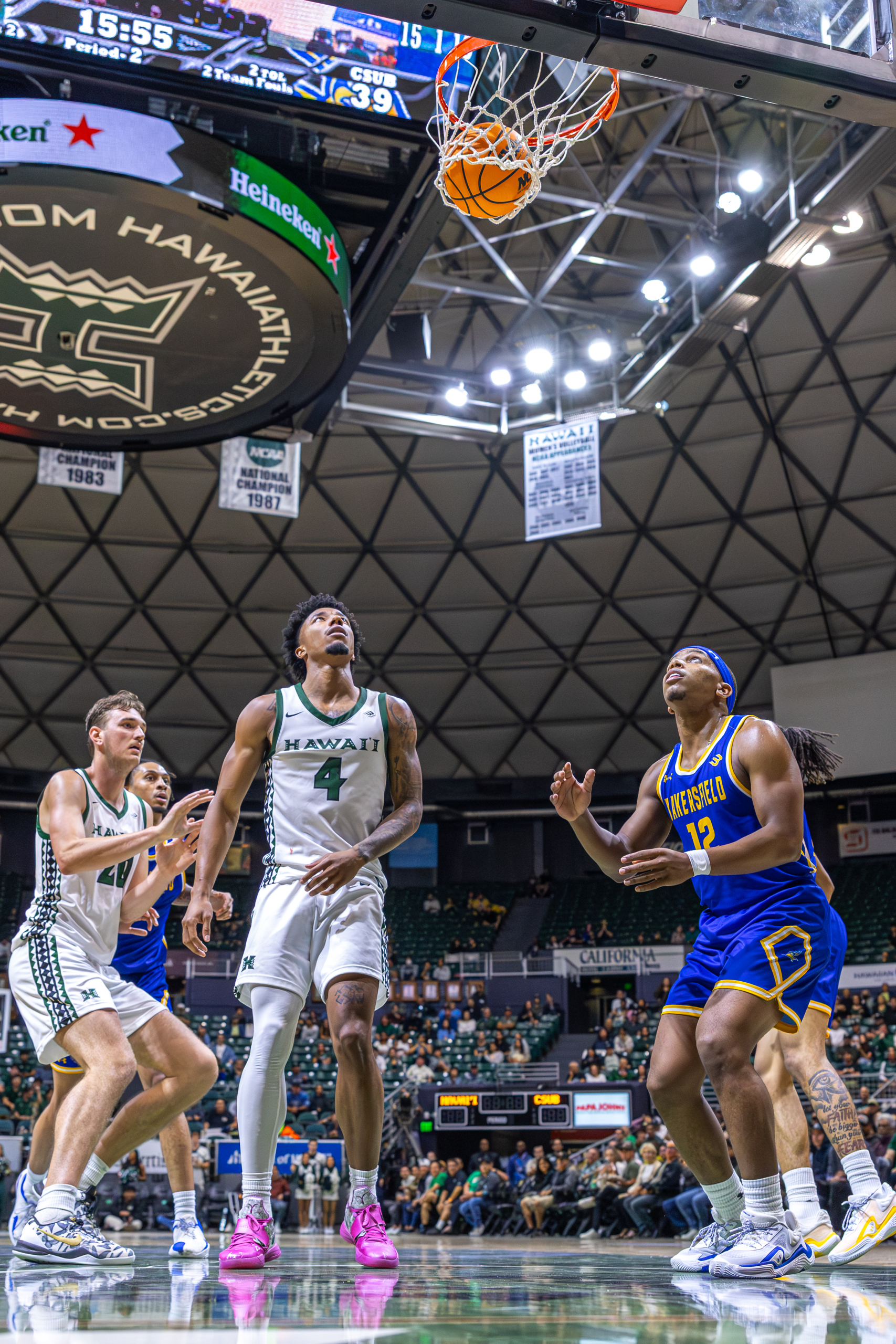 The dunk set the tone for the night, fitting for an evening that would mark a major milestone in Bullock’s collegiate career, as he led the Rainbow Warriors to a dominant 98–71 win over Cal State Bakersfield (8-13, 2-7 Big West), bouncing back after a loss at UC Santa Barbara.