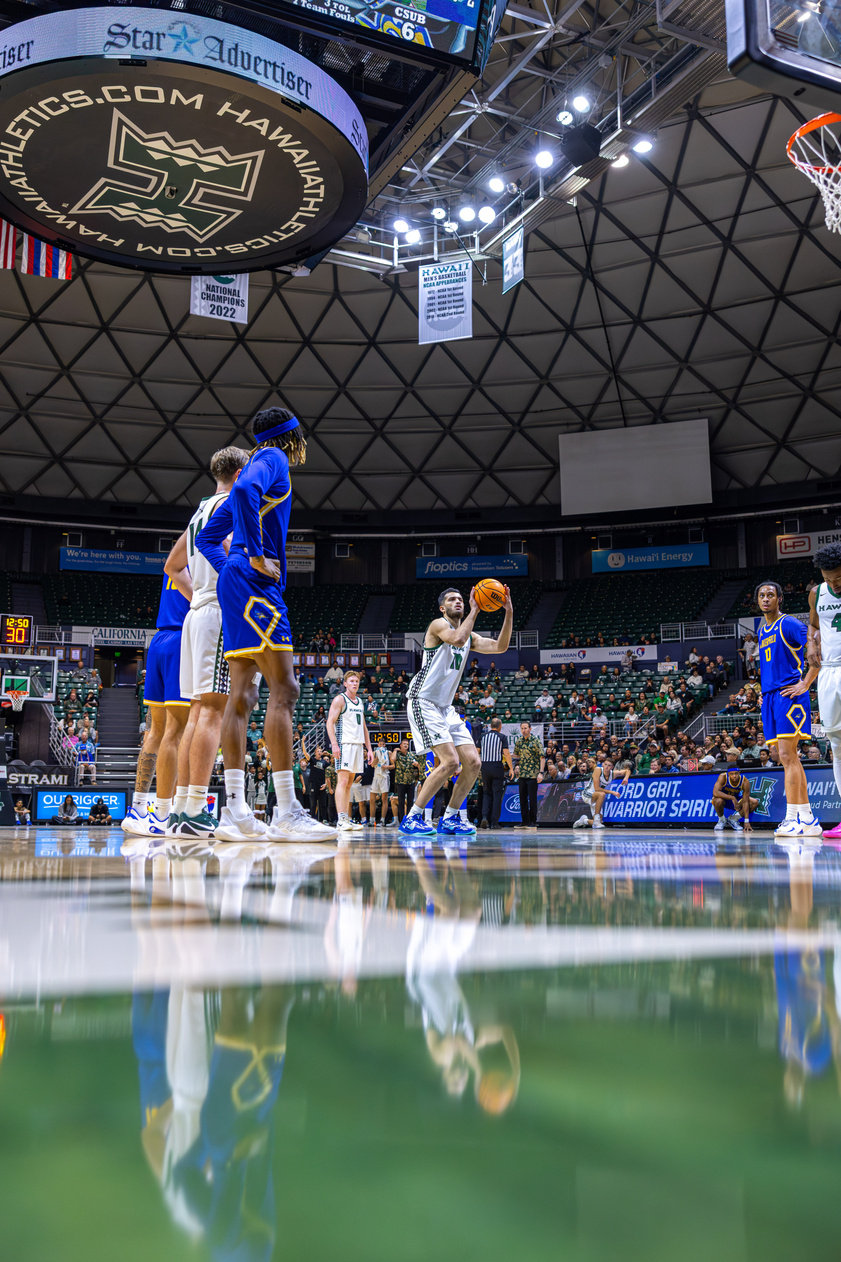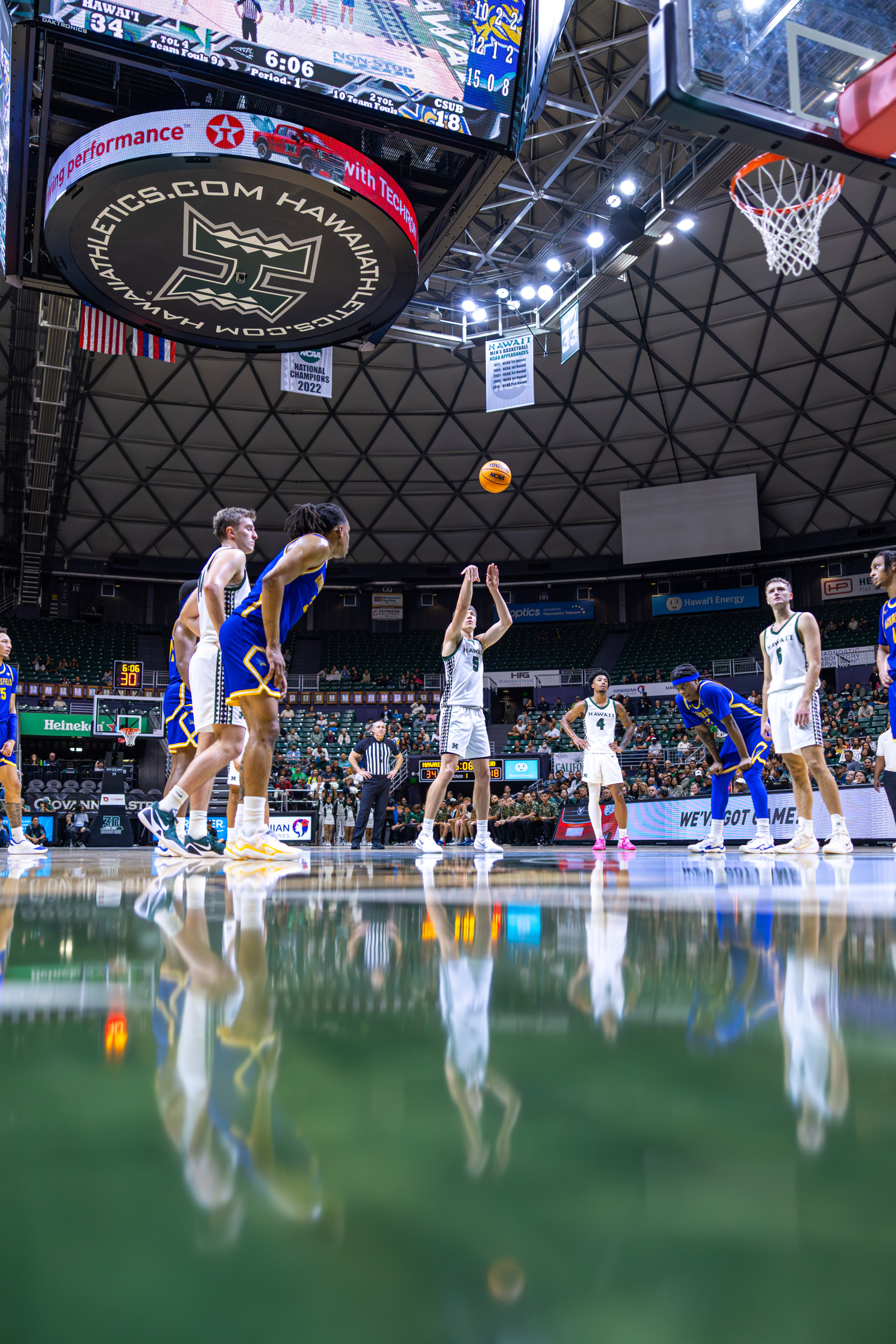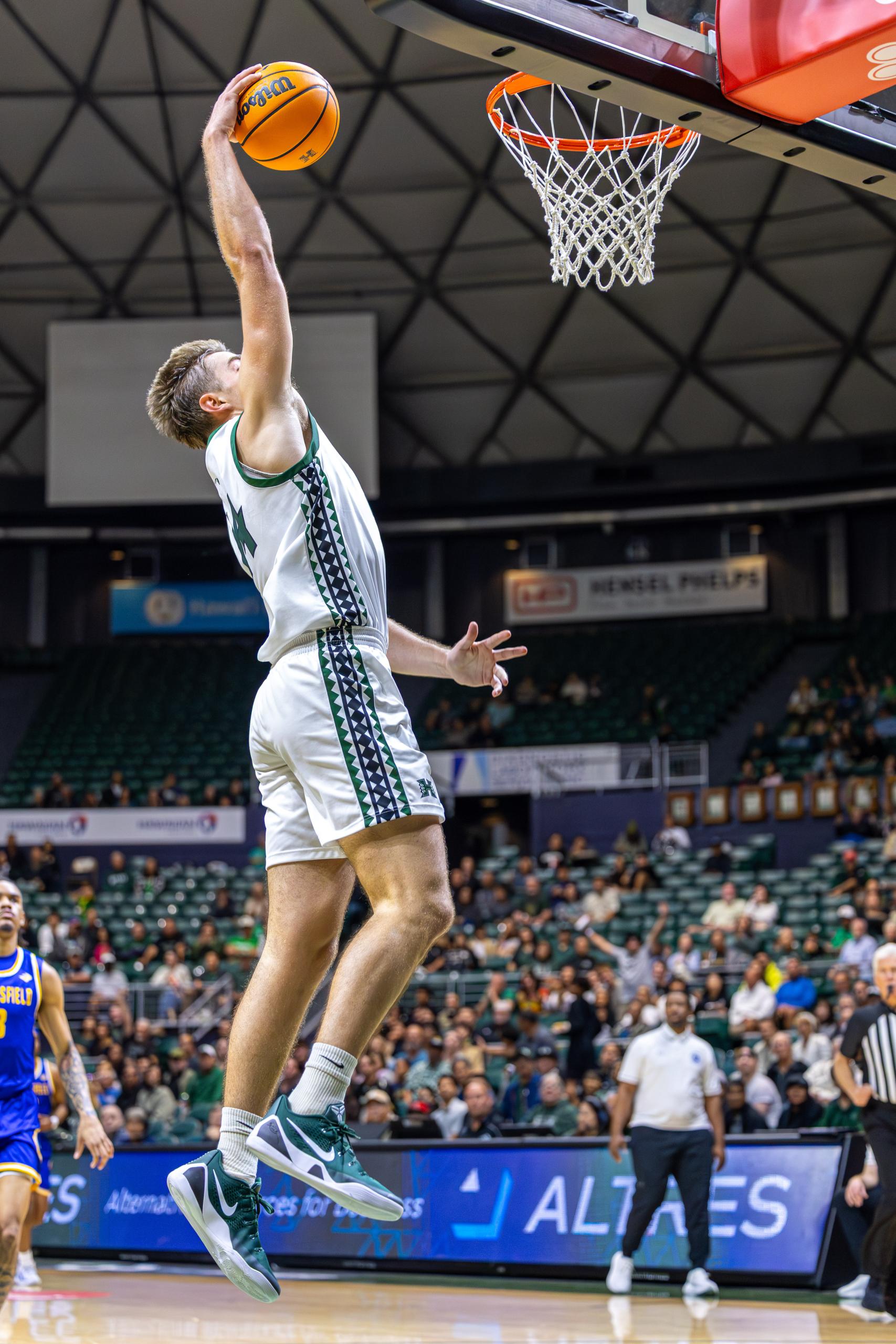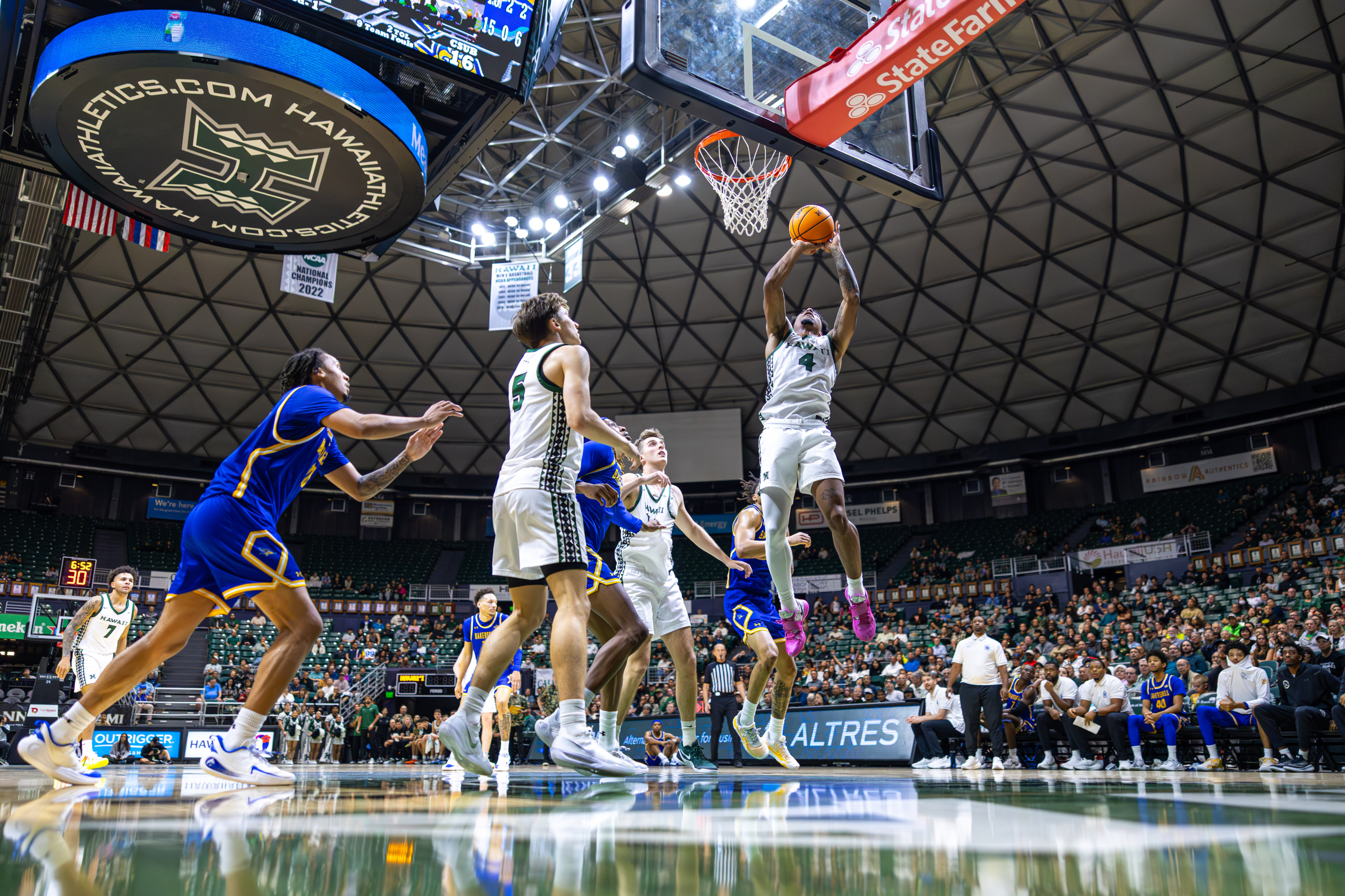 Bullock read it instantly. He blew past the pressure with a speed dribble, leaving multiple Roadrunner defenders behind. Seeing a clear lane to the basket, Bullock attacked the paint and threw down a vicious tomahawk slam, igniting the crowd and opening the scoring for Hawai‘i.