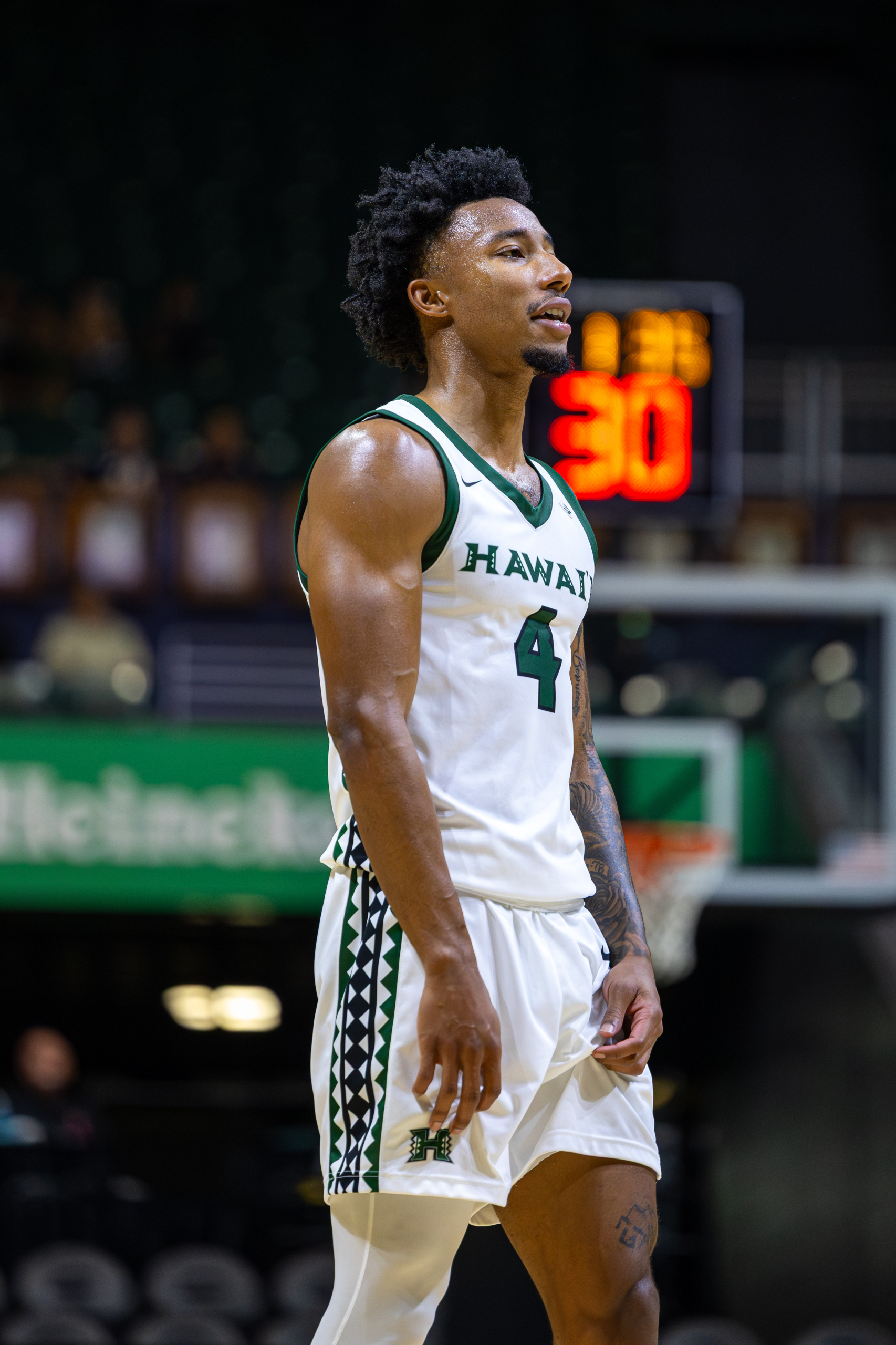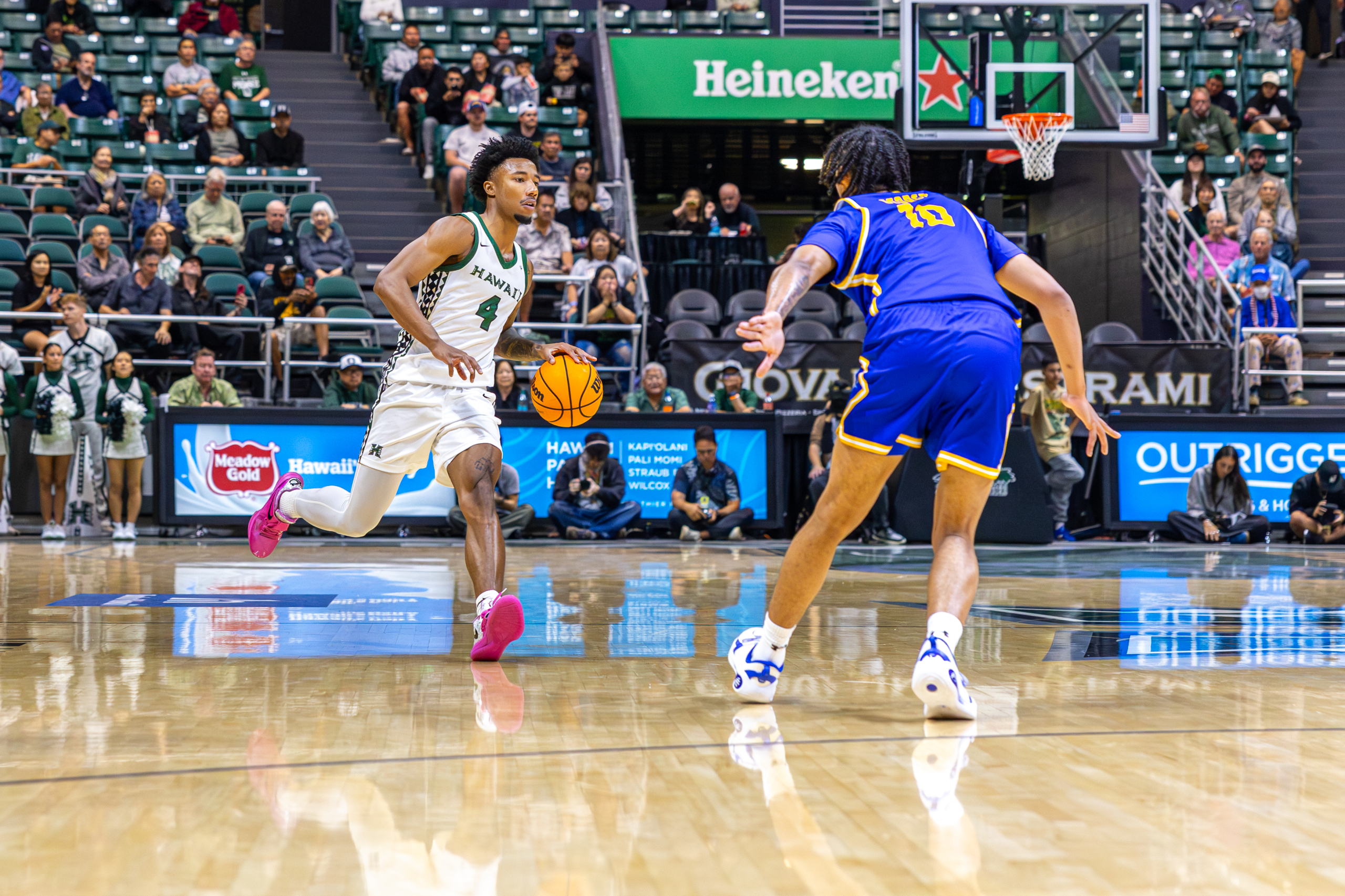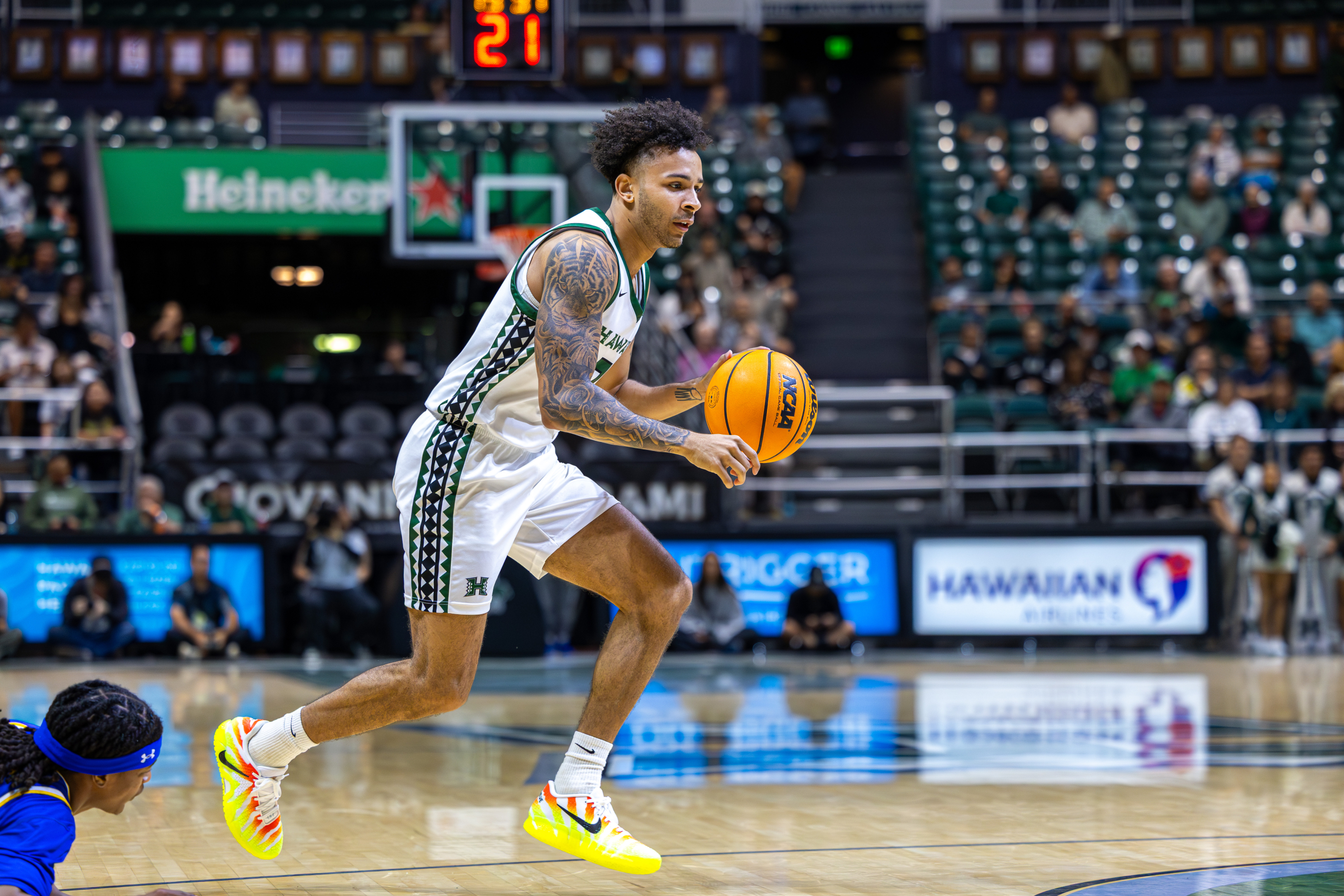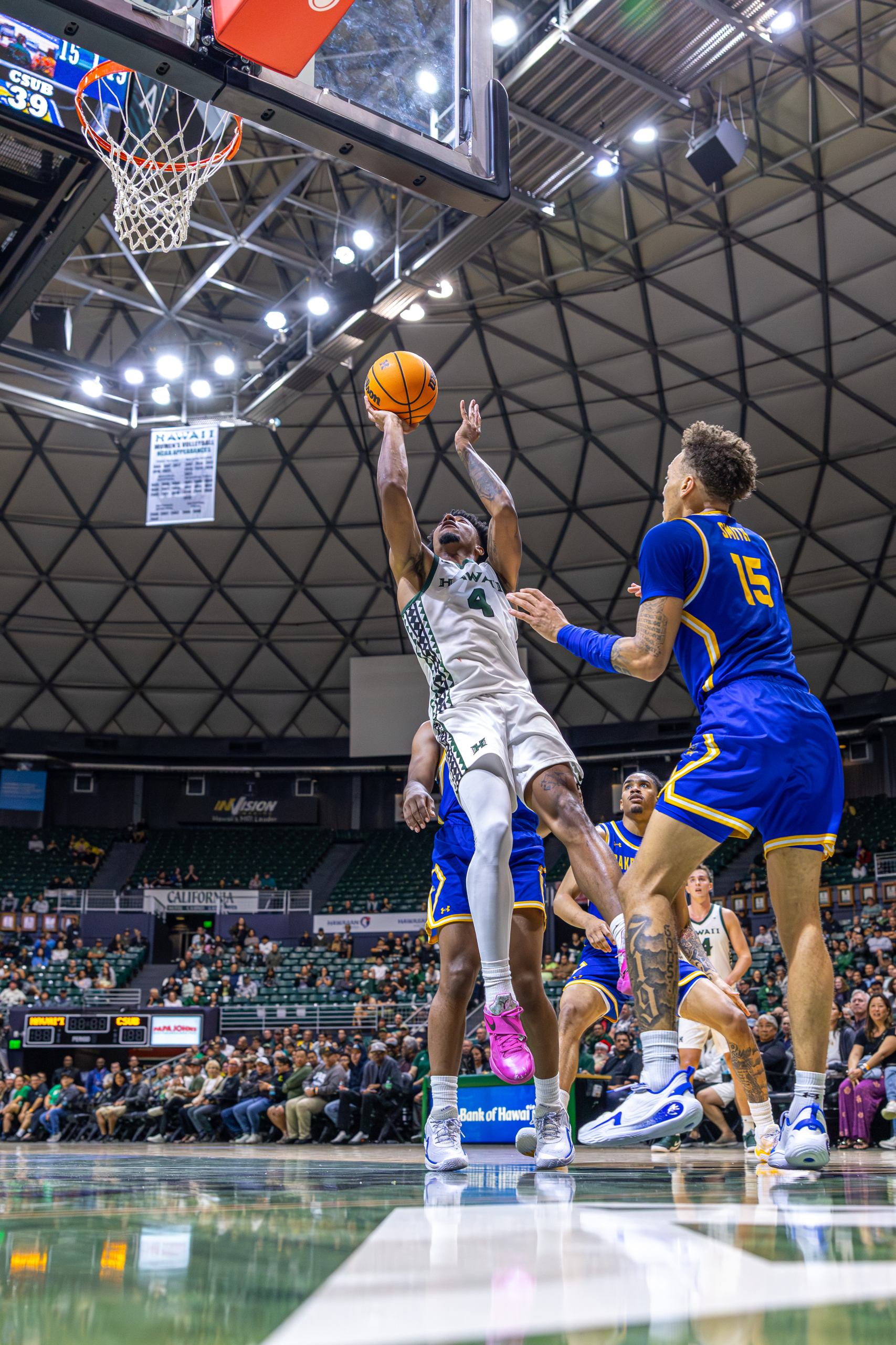 Bullock read it instantly. He blew past the pressure with a speed dribble, leaving multiple Roadrunner defenders behind. Seeing a clear lane to the basket, Bullock attacked the paint and threw down a vicious tomahawk slam, igniting the crowd and opening the scoring for Hawai‘i.