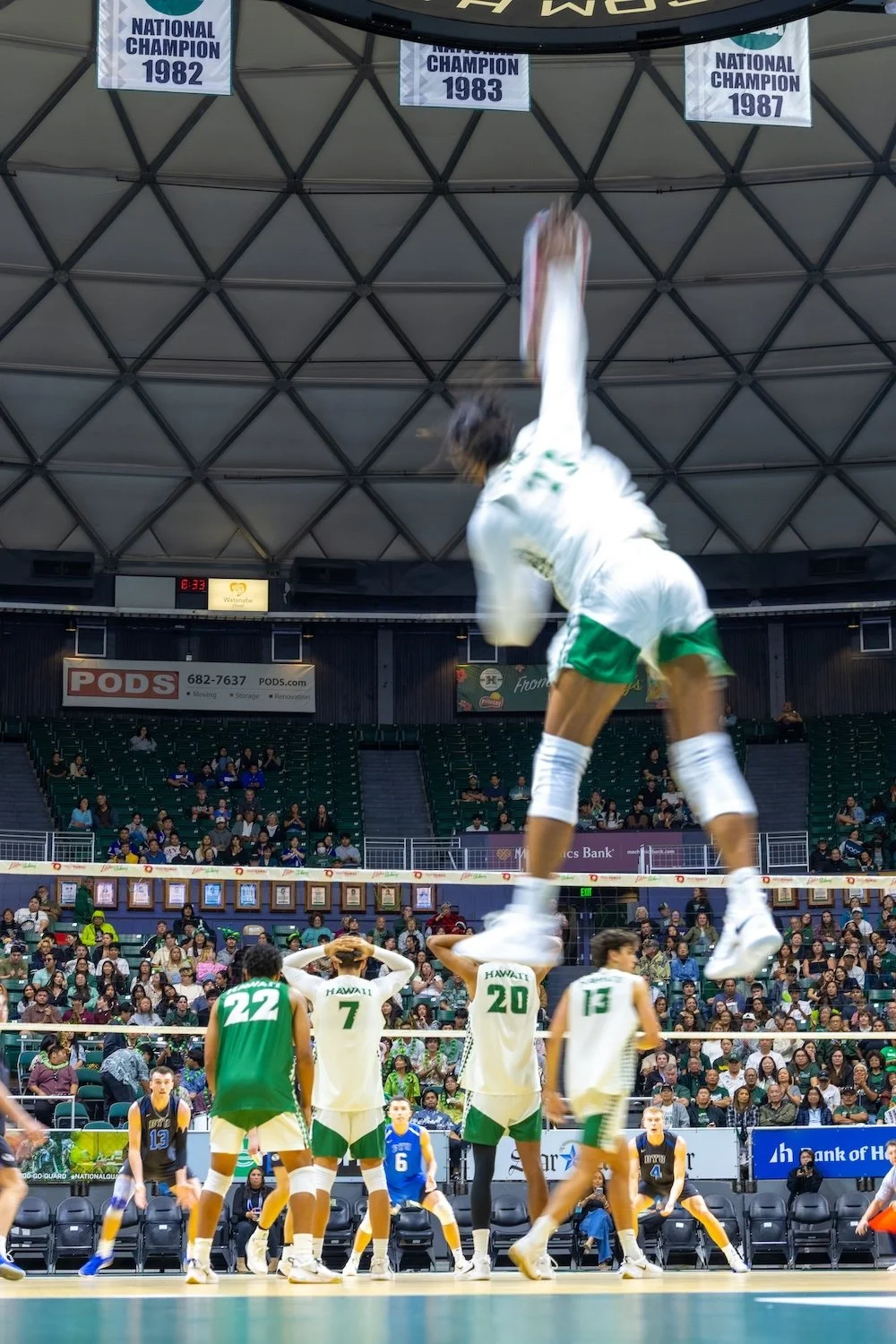 1. Home Sweet Home – January 16th seemed so long ago. Prior to the BYU series added on February 6th after the NIL Tournament was officially cancelled on January 27th, it would have been 47 days since the last Hawai`i home match. In between, UH had: multiple flight cancelations getting to Chicago’s O’Hare airport, an unexpected overnight stay in Chicago, seen multiple inches of snow in Pennsylvania, a team vehicle broken into while having dinner at Stanford and a couple of bye weeks. Lots of credit goes to first-year UH Assistant Coach Donan Cruz as he was the one to scour through opposing schedules to see which team(s) had an open week and eventually reached out to BYU’s Head Coach Shawn Olmstead. What began with multiple texts and phone calls then became conversations that included both schools’ Athletic Directors (Matt Elliott for UH, Brian Santiago for BYU) and ultimately led to BYU’s first trip to Honolulu since 2020. The Rivalry Series, presented by OUTRIGGER came to fruition on less than three weeks notice. Not only did UH add a two-match series to their schedule to replace the NIL Tournament on such short notice, but it was a name team that was also ranked and a school that UH fans love to root against. BYU came in on a 9-match winning streak and playing some of the best volleyball amongst anyone in the country. A total of 11,293 fans (4800 on night one, 6493 on night two) came through the gates to not only see this team at home for the first time in 40 days, but they helped to contribute to the UH Men’s Volleyball NIL fund as well. The second night saw season-high numbers in both tickets issued (6989) and turnstile (6493). Stoked to play at home for quite some time, UH hit over .430 each night, en route to the two-match series sweep over the Cougars and a nice start to this now seven-match homestand.