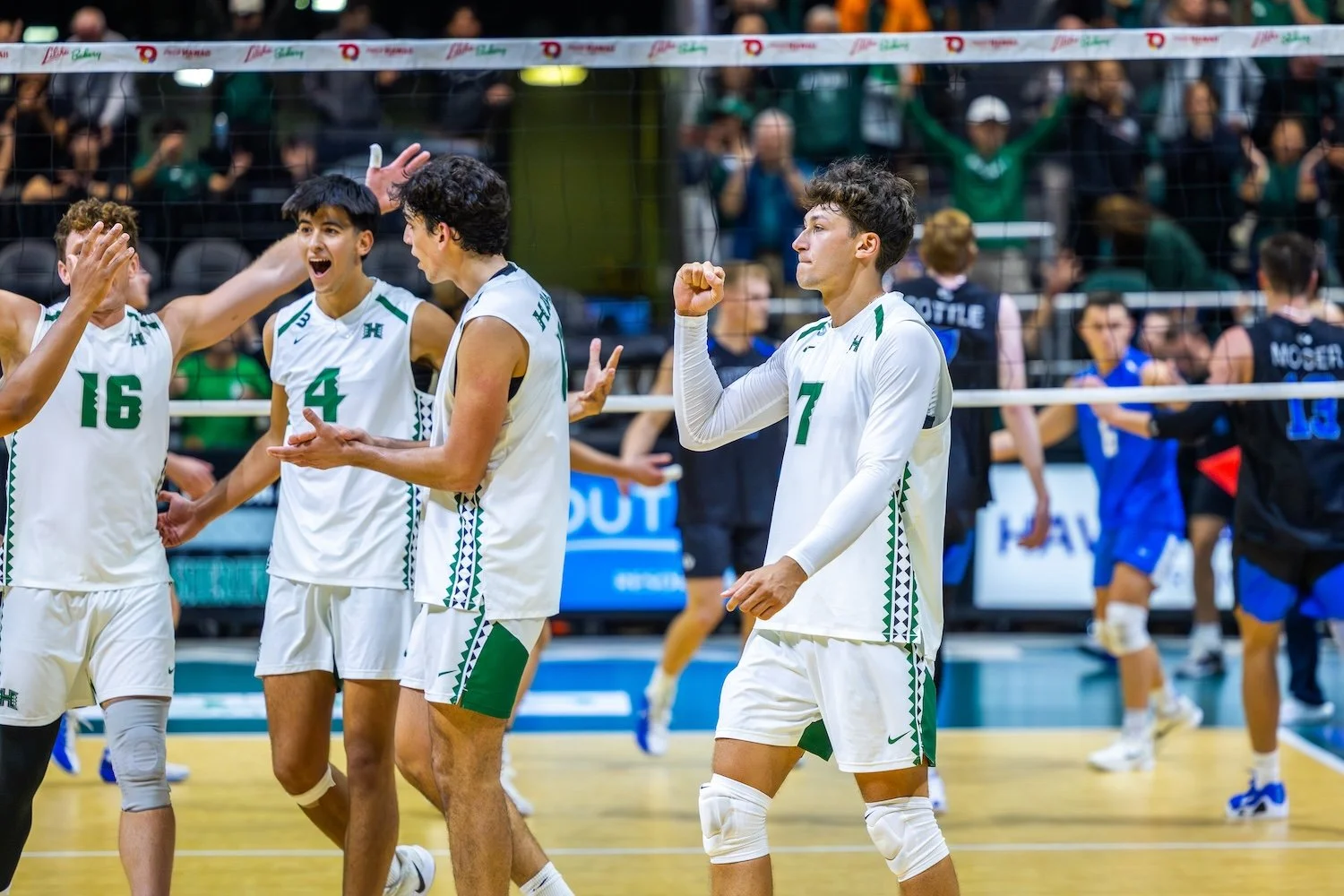 2. Beat. Them. Again. – The last time BYU came to Honolulu, it was 2020. Two teams ranked one and two. The Cougars won the first night in straight sets and led 2-0 in the second match before UH mounted a furious comeback that was finished by Pat Gasman’s walk-off ace. No one could have foreseen that it would ultimately be the final match of the season as the Covid-19 pandemic cancelled the rest of the season one week later. An unexpected, top-6 matchup at home on three weeks notice drew 4800 on night one. What began as a tied match score through two sets that were each decided by two points ended with Hawai`i outscoring BYU 50-35 (25-17, 25-18) over the final two sets to not only snap BYU’s 27-set win streak, but also end their 9-match overall winning streak, while extending their win streak to 10. Tread Rosenthal ran an offense that hit .451 (61-11-113), the highest hitting percentage allowed by the Cougars all season long. BYU hit a very respectable .386 (52-13-101) but it was the block and numerous scoring runs that put UH over the top in the final two sets. 45 of the 63 kills came from UH’s pin hitters. A day off in between competition allowed for recovery but it couldn’t slow down UH’s high-octane offense. For an 11th time this season, UH hit over .400 (.446). The two main differences in the rematch was the Hawai`i defense and serve-receive. The Rainbow Warriors held BYU to a .183 hitting percentage and for Trent Moser, who had a match-high 18 kills in night one, BYU’s leading attacker in kills per set was held to just two kills in two sets before being subbed out. After tying their season-high of eight aces in the first match, the Cougars didn’t record an ace in the rematch. Hawai`i also out-blocked BYU again, this time 9 to 5.5. Set 2 (25-21) was the smallest set margin of victory for UH and even then, it was only close due to seven Rainbow Warrior service errors. Hawai`i has now won six straight and seven of the last eight against BYU. How sweet it is to #BeatBYU…twice.