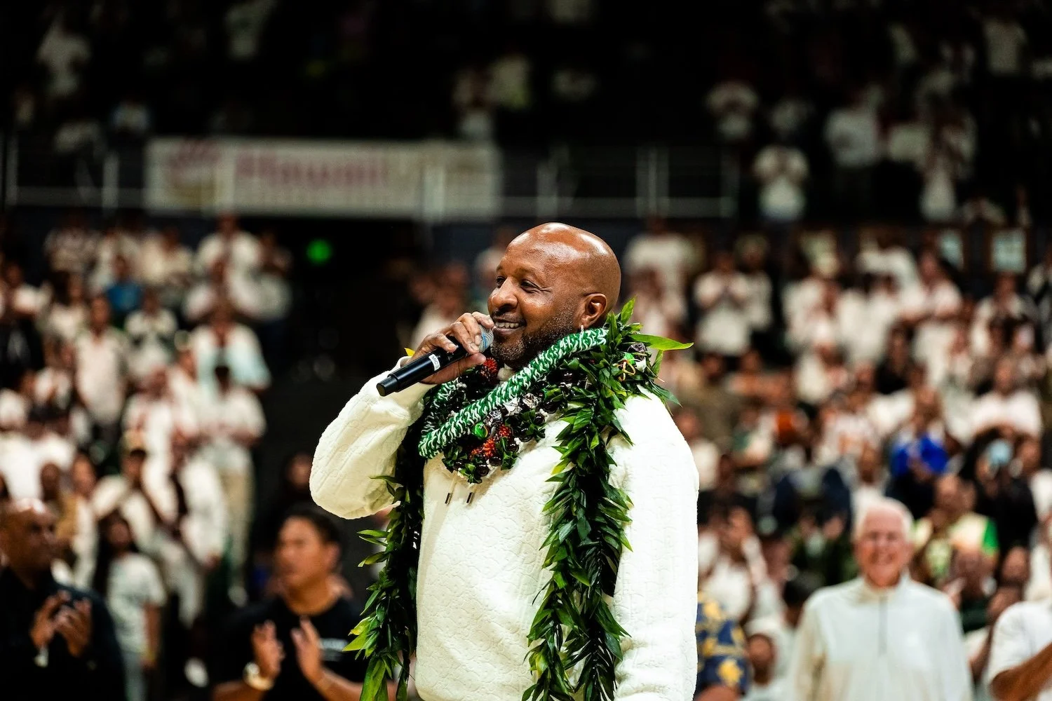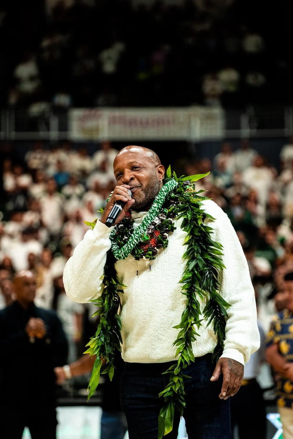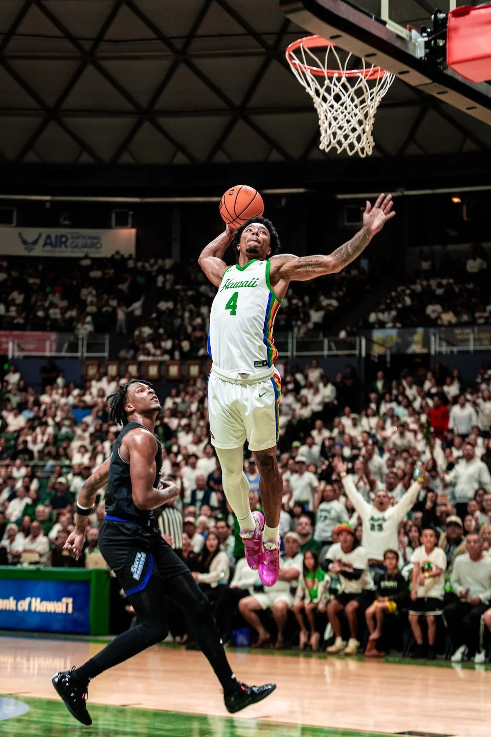 Nearly 8,000 fans packed the Stan Sheriff Center at Bank of Hawaiʻi Arena, creating a whiteout atmosphere to honor former Rainbow Warrior guard Anthony Carter. Carter’s No. 23 became just the second jersey retired in program history.